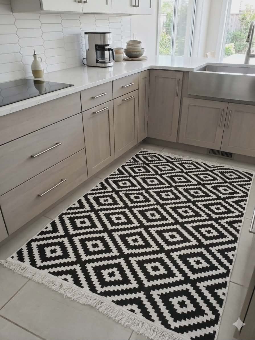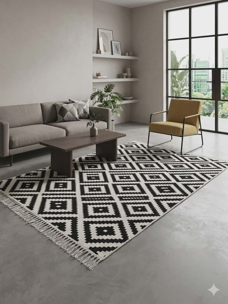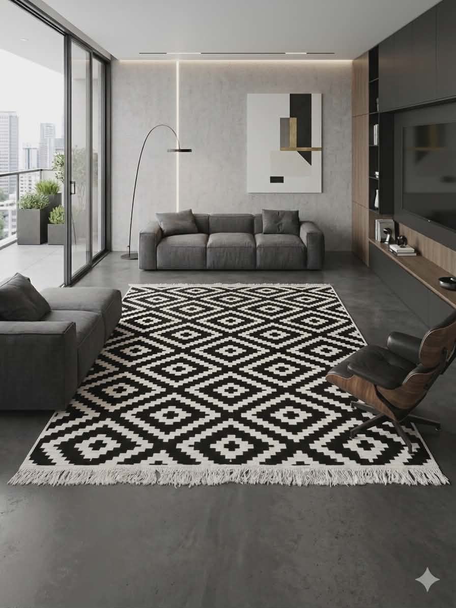 Acest covor are un design modern, deosebit, cu franjuri decorativi la ambele capete!