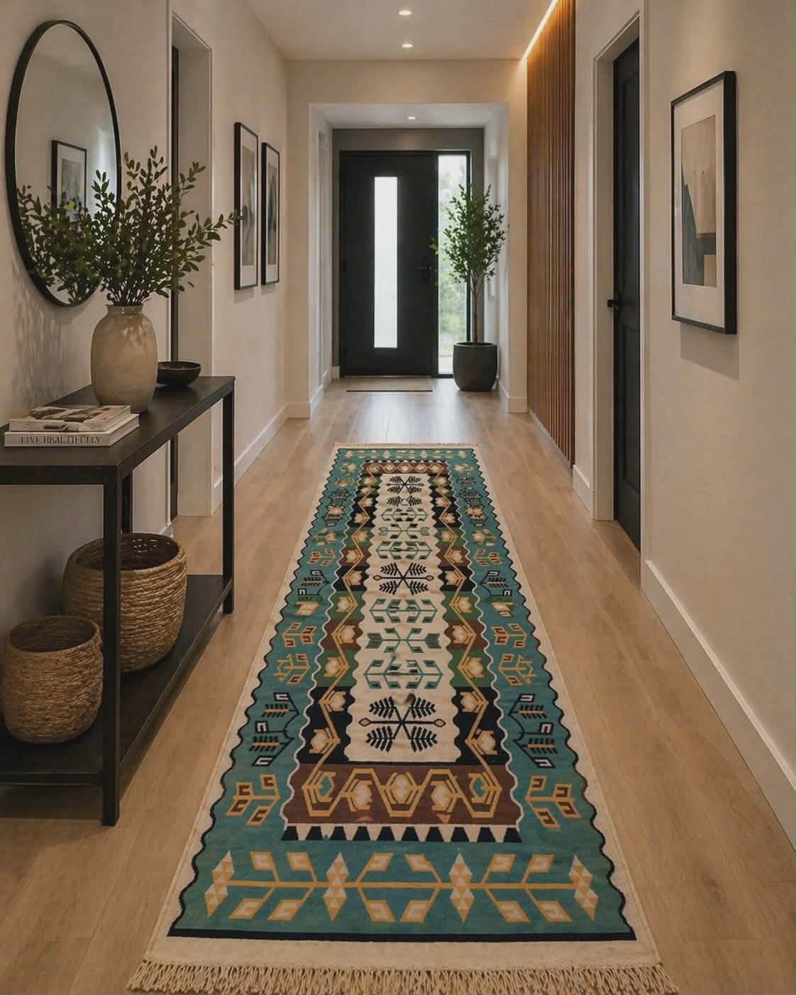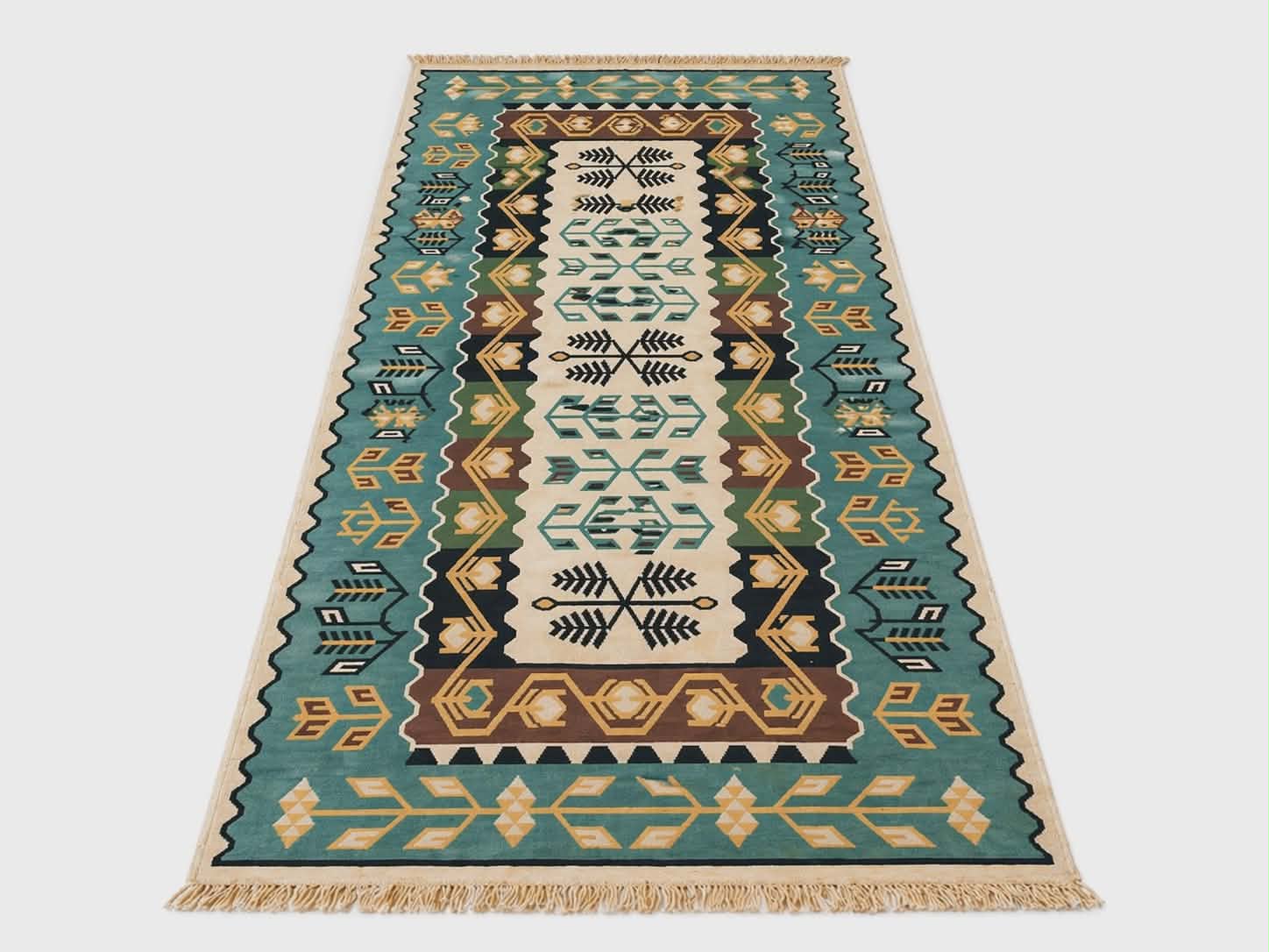 Covorul are un model deosebit, cu motive traditionale si cu franjuri decorativi la ambele capete !