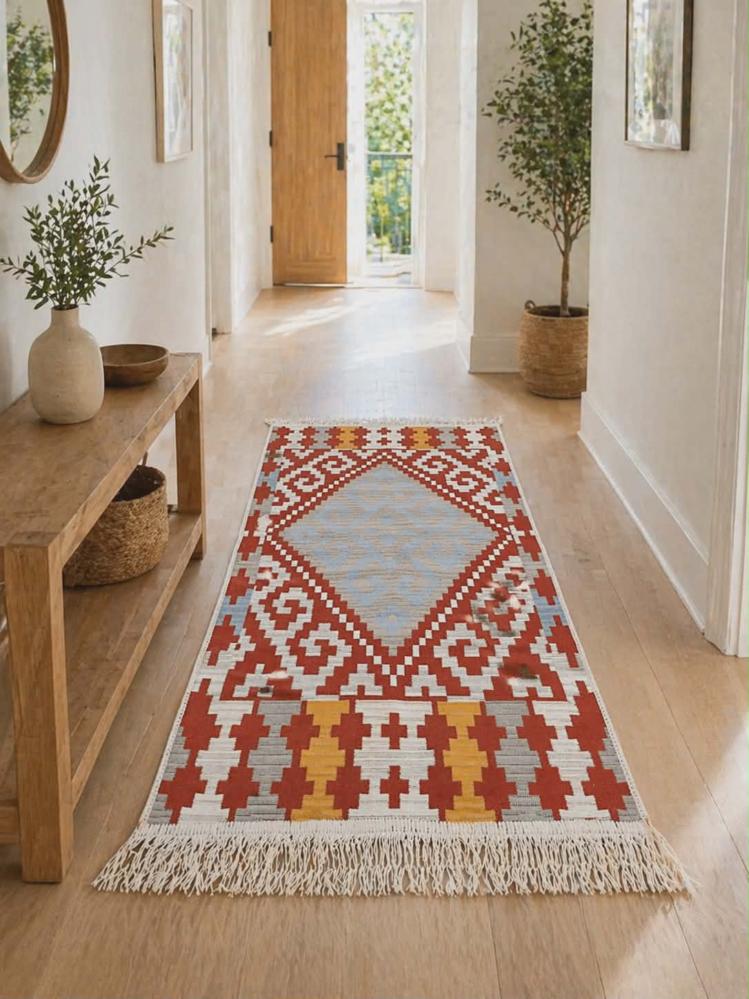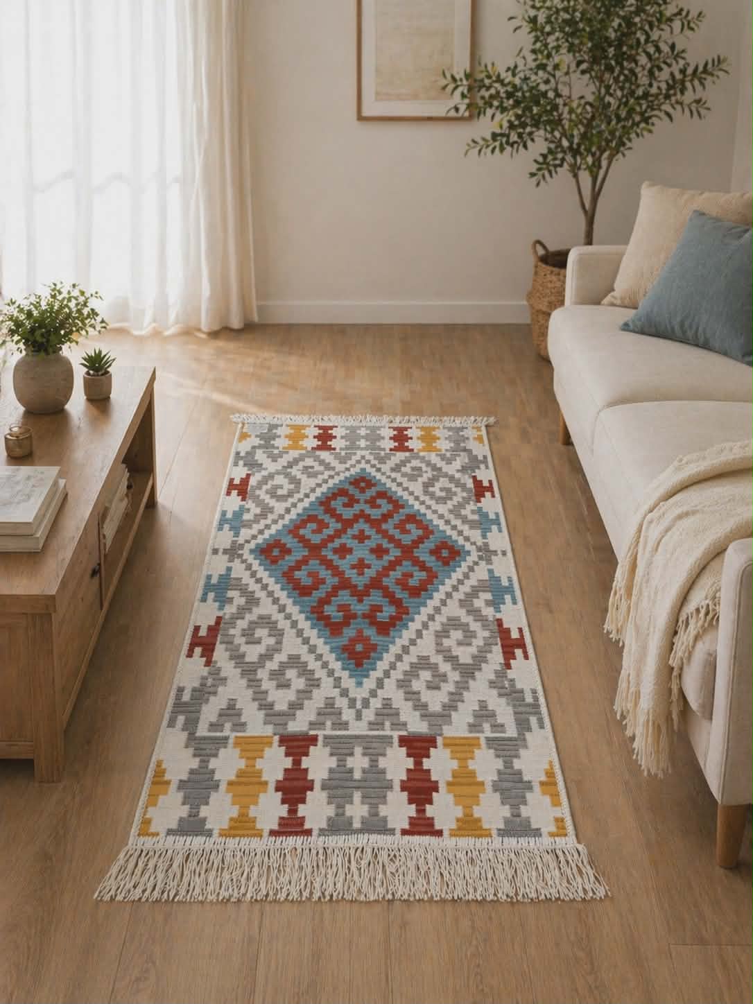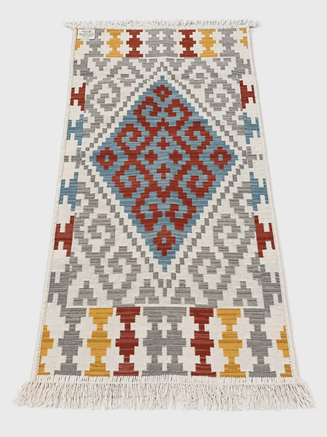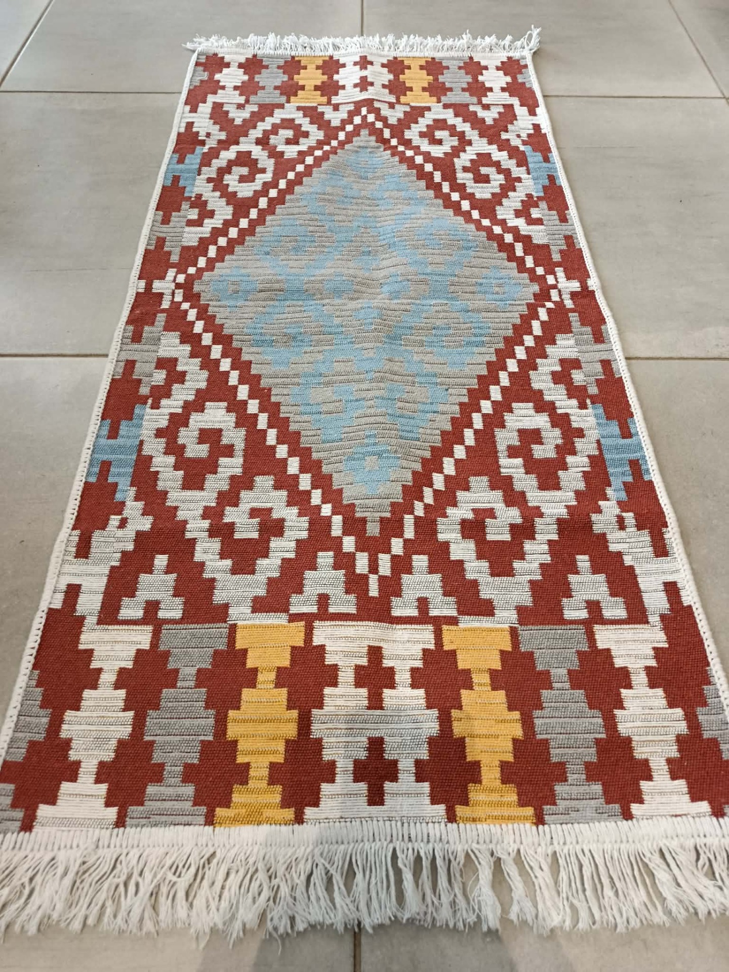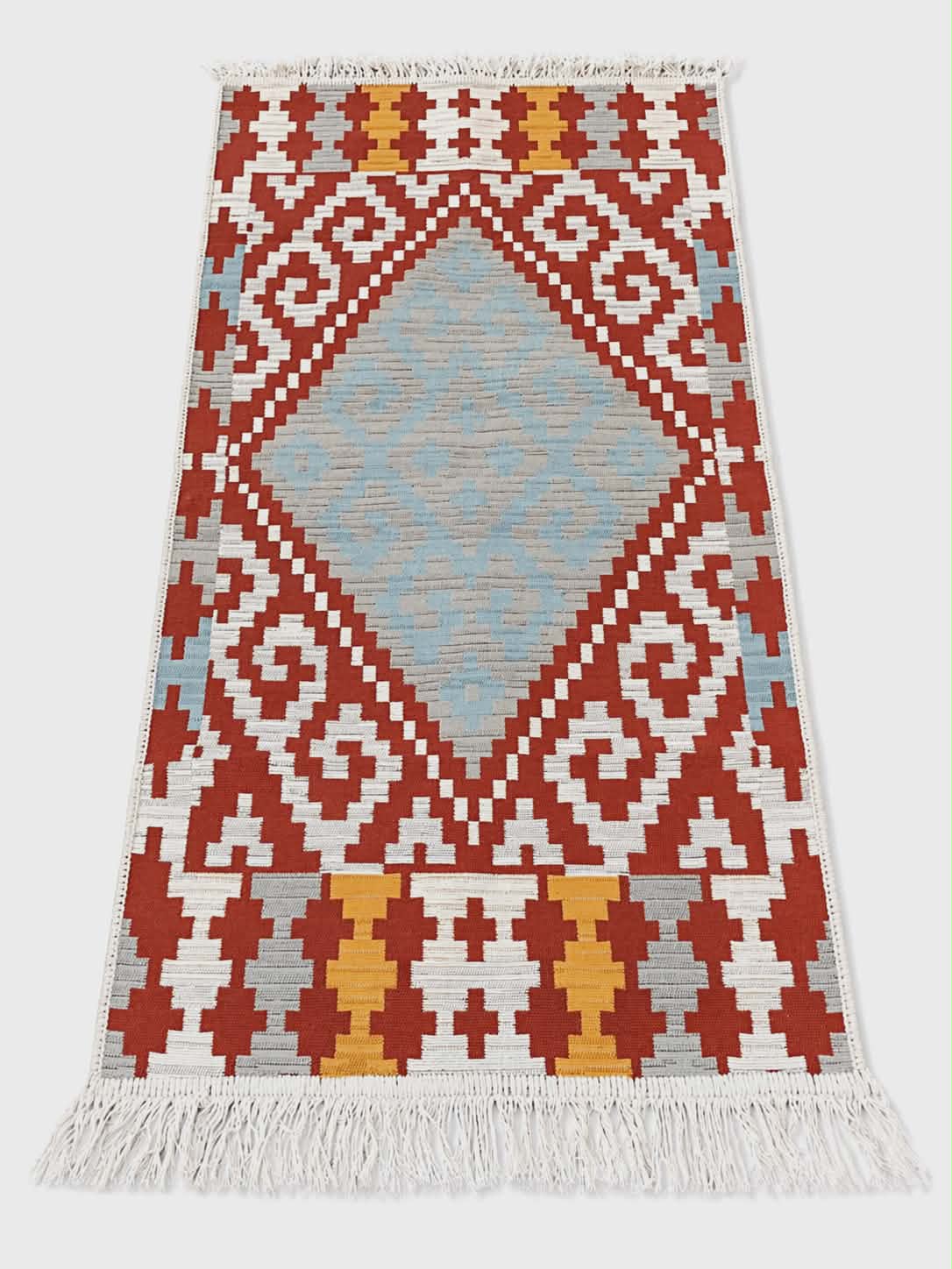 Covorul are un model deosebit, cu motive traditionale, si cu franjuri decorativi la ambele capete !