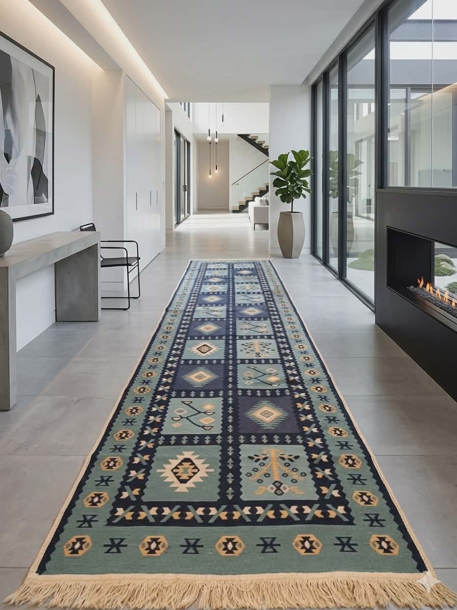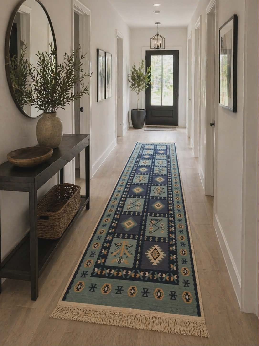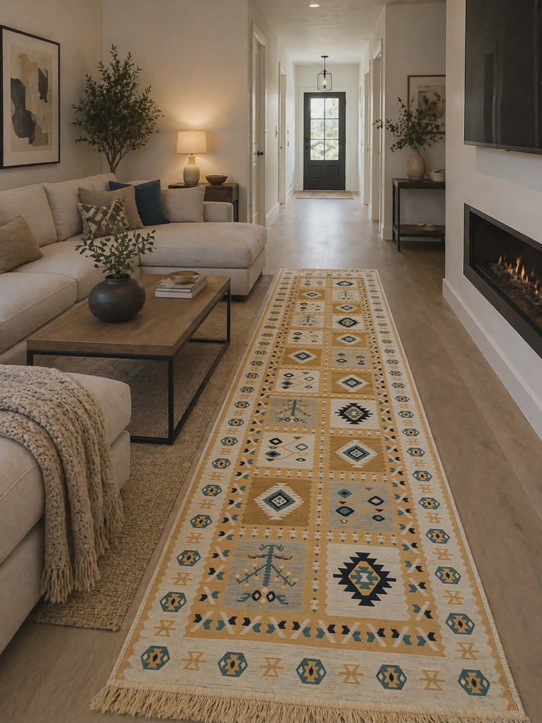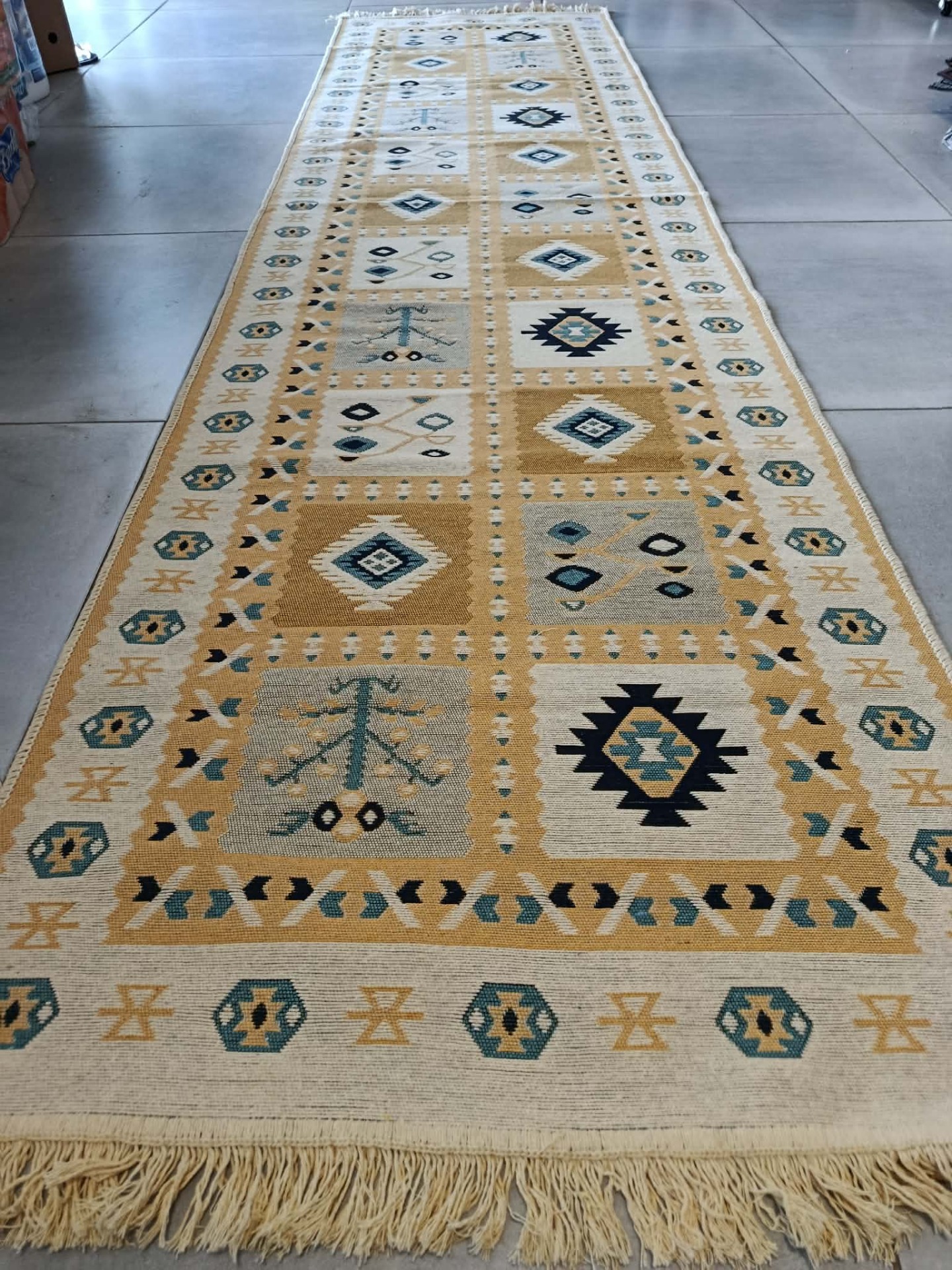 Covorul are un model deosebit, cu motive traditionale si cu franjuri decorativi la ambele capete !