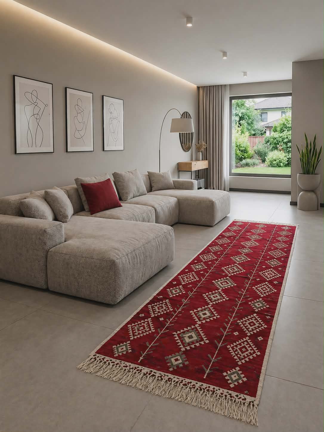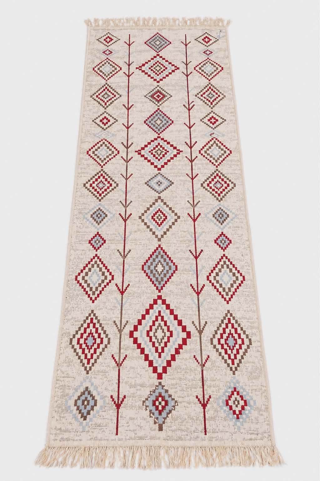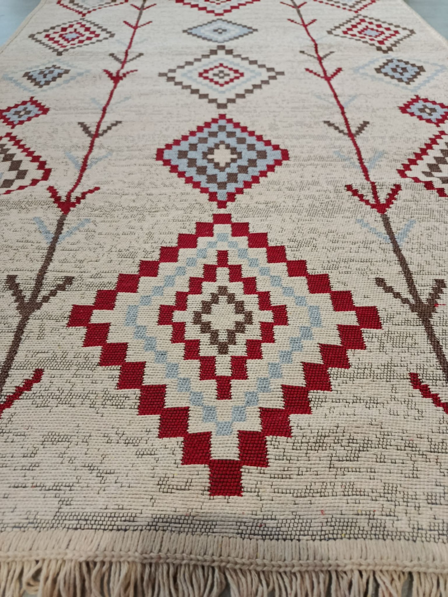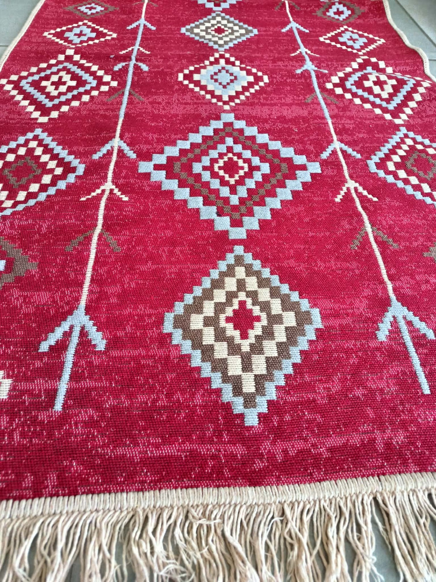 Covorul are un model deosebit, cu 2 fete , cu motive traditionale, si cu franjuri decorativi la ambele capete !