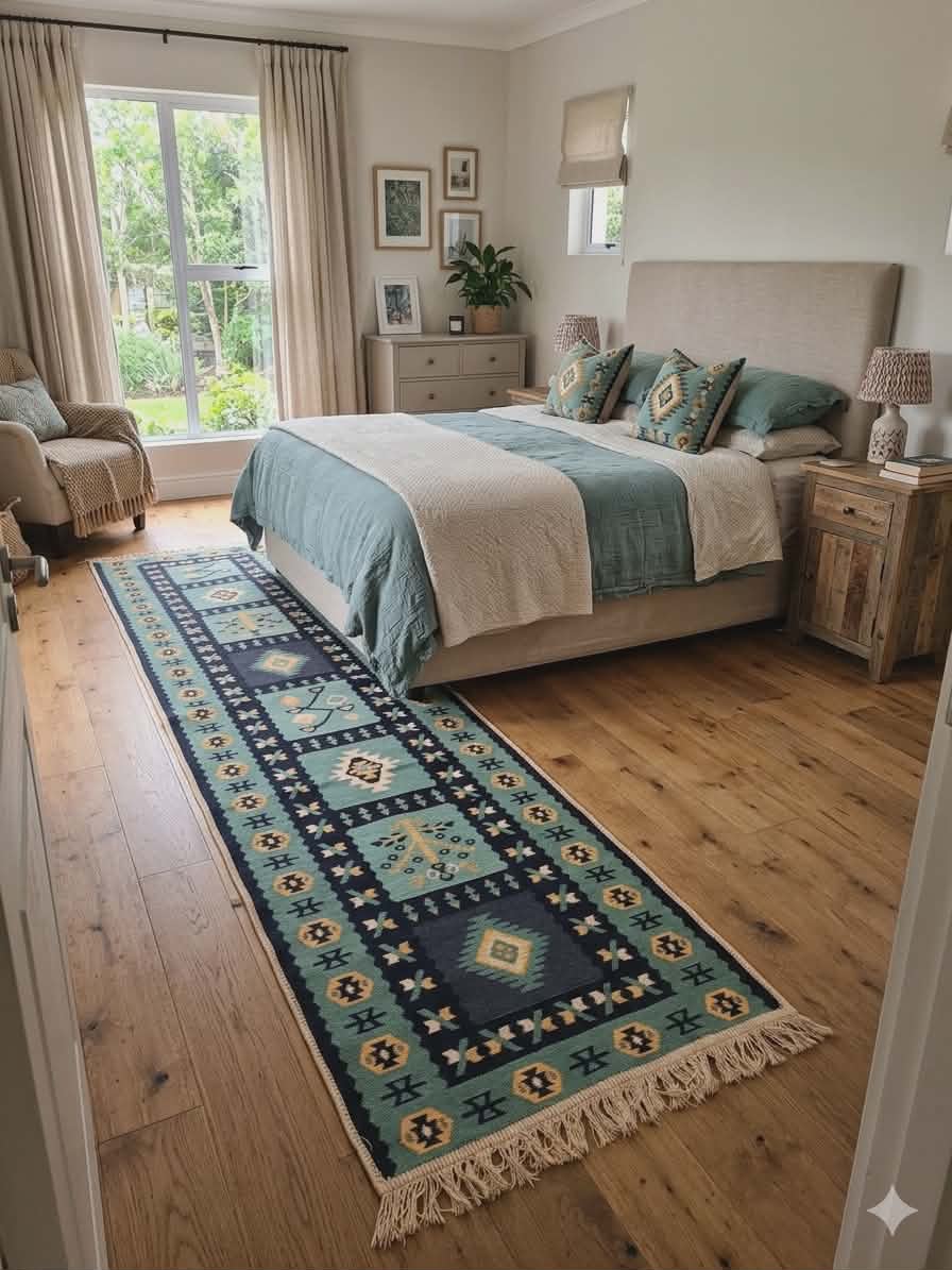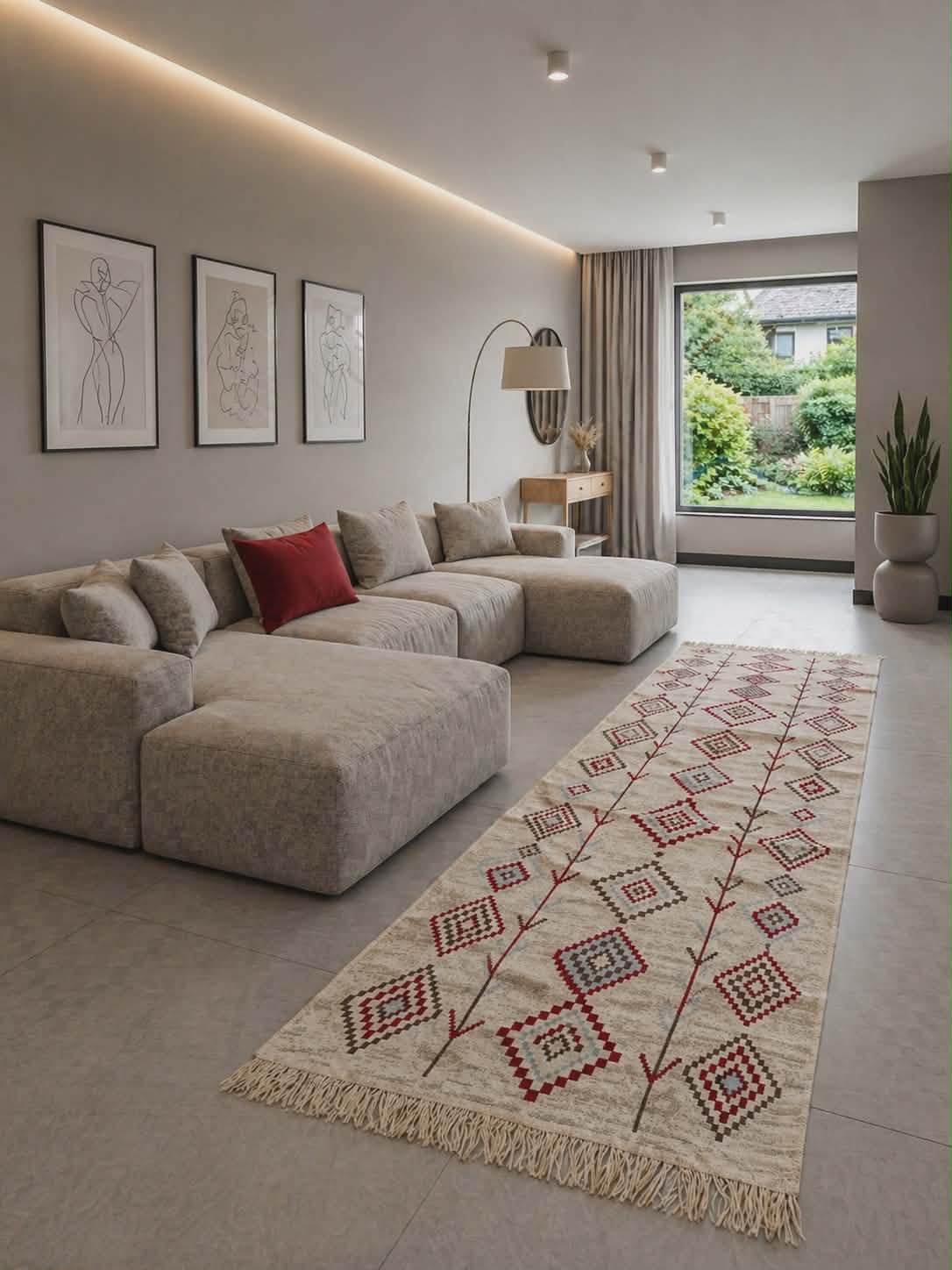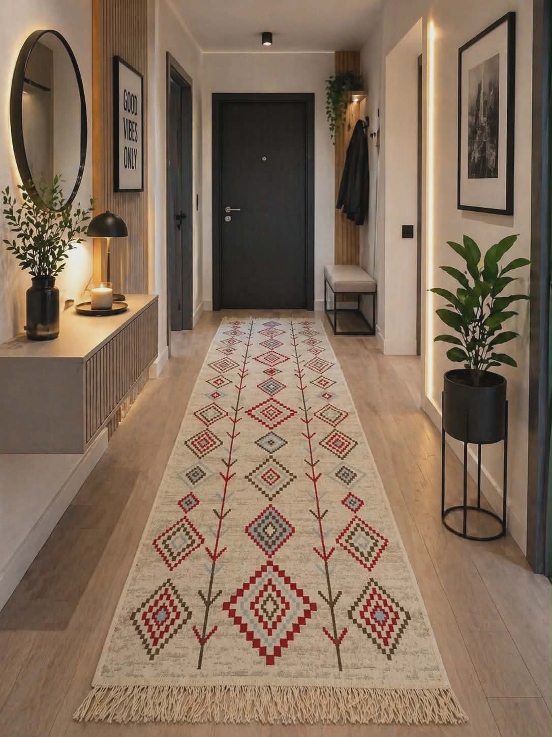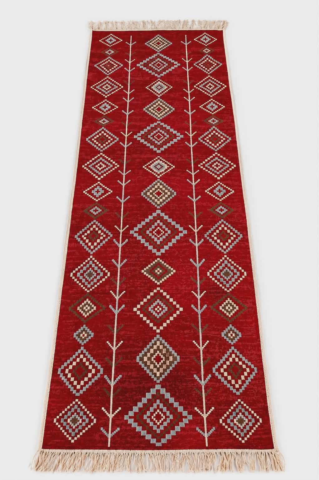Covorul are un model deosebit, cu 2 fete , cu motive traditionale, si cu franjuri decorativi la ambele capete !