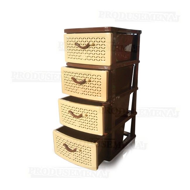 Dulap universal 4 sertare plastic, maro, alb, albastru Cu o inaltime de 90 cm si 4 sertare incapatoare , dulapul optimizeaza organizarea spatiului din aproape orice mediu: bucatarie, dormitor, camera copilului, debara, terasa, spatii comerciale, birouri etc. Dimensiuni: Lungime: 45cm Latime: 38cm Inaltime: 90cm Greutate: 5.8 kg